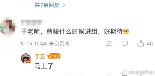 有粉丝问于正曹骏啥时候进组,于正:马上!