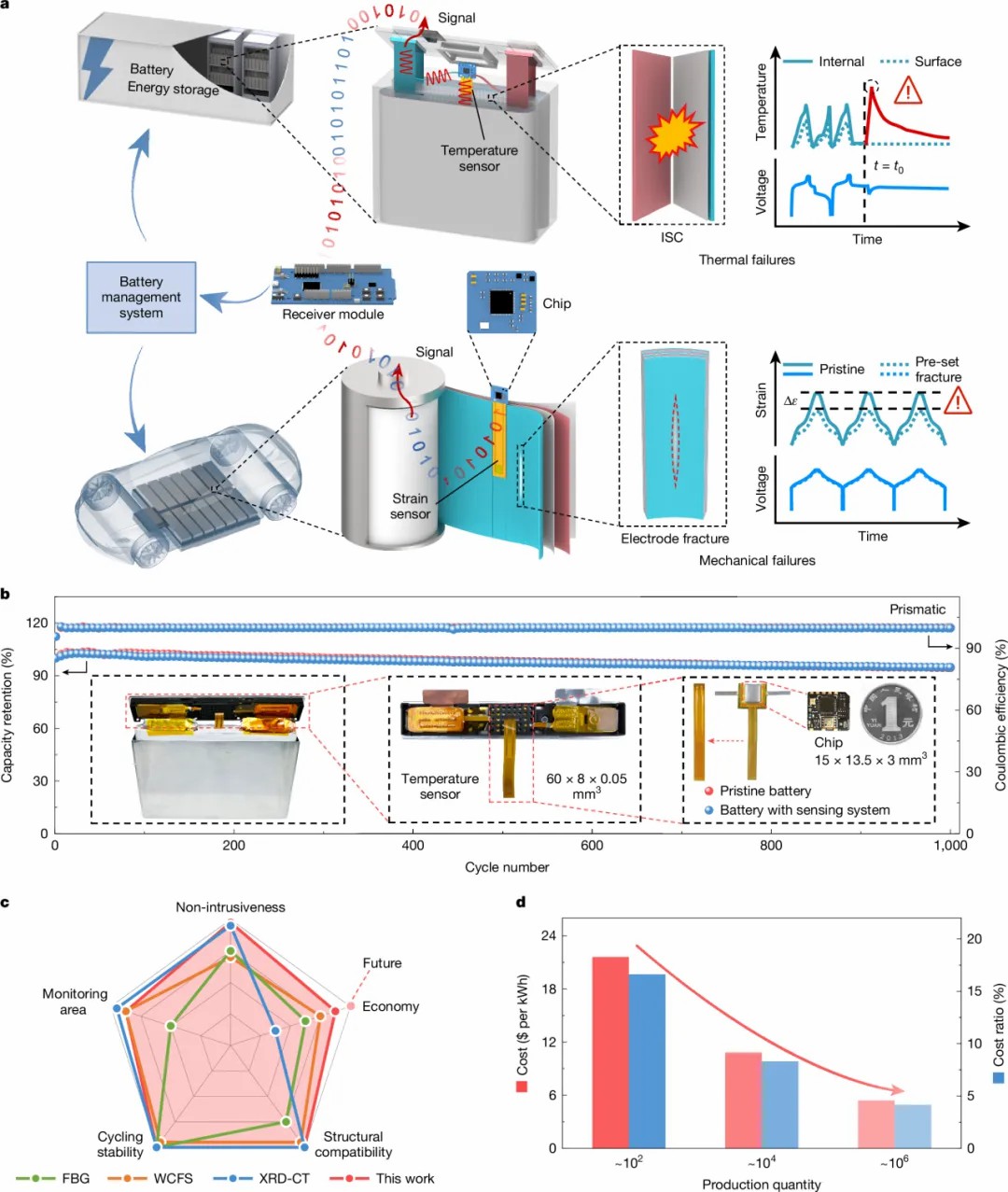 区别于欧美的技术体系与思路,北京理工大学先进结构技术研究院陈浩森教授团队历经十余年多学科交叉攻关,另辟蹊径,提出“中国方案”:(1)耐腐感知(测得准):研制50μm薄膜耐化学/电化学腐蚀传感器,解决了植入传感器长寿命需求与电化学腐蚀环境的问题;(2)无损植入(埋得进):提出兼容工业制造流程的无损植入工艺,解决了传感器植入需求与电池全寿命周期稳定服役的问题;(3)跨屏传输(传得出):研制基于载波传输的微型通信芯片,解决了传感信号高效传输需求与电池单体外壳电磁屏蔽的问题;(4)智能预警(用得好):基于长期监测电池内部传感信号构建数据驱动分析模型,初步应用于单体电池内部失效早期预警。