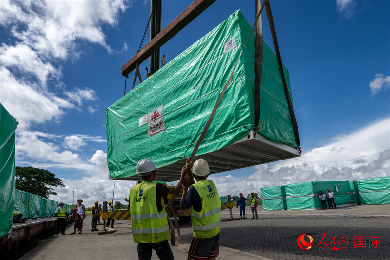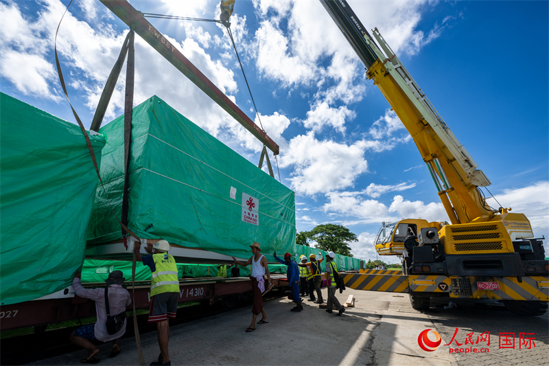 5月14日,当地工人将援缅第十四批紧急人道主义地震救灾物资吊装上火车运往灾区。人民网记者 谢佳君摄