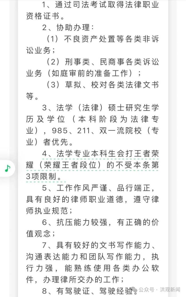 律所招聘要求本科生游戏段位达王者 独特要求引热议!