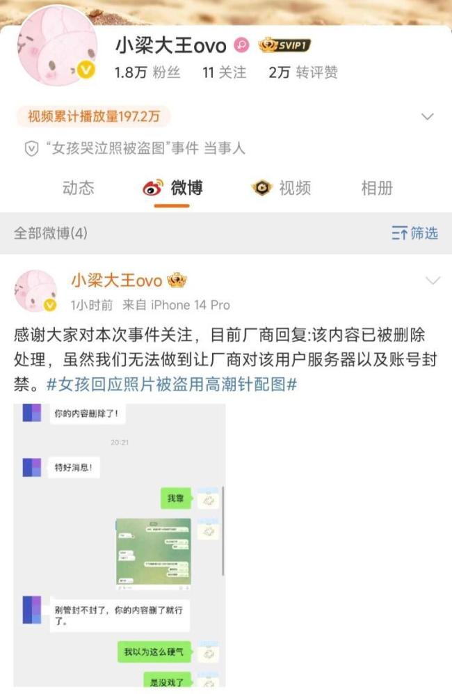 19岁女生图片被盗事件进展 侵权内容已删除!近日,网民梁女士通过视频爆料称,她两年前拍摄的一张哭泣自拍照片被黄色网站和不良广告多次非法盗用。在近期网络热议的“高潮针”话题中,这张照片也被使用。5月14日晚上8点多,梁女士再次通过社交平台发声,表示已收到答复,涉及盗用其照片的内容已完成删除处理。