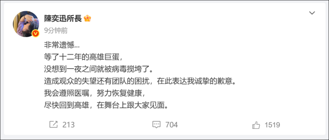 陈奕迅本人也在微博上表达了遗憾之情,称等了十二年,一夜之间被病毒搅垮了。陈奕迅出生于1974年7月27日,中国香港出生,祖籍广东省东莞市,是华语流行乐男歌手、影视演员及作曲人。他于1995年参加第14届新秀歌唱大赛获得冠军并正式出道,次年发行个人首张音乐专辑《陈奕迅》。2003年,他发行了个人首张概念音乐专辑《黑白灰》。2021年,其单曲《孤勇者》获得了广泛关注。2025年1月28日,他参加了《2025年中央广播电视总台春节联欢晚会》,与奥运健儿共同演唱歌曲《孤勇者》。