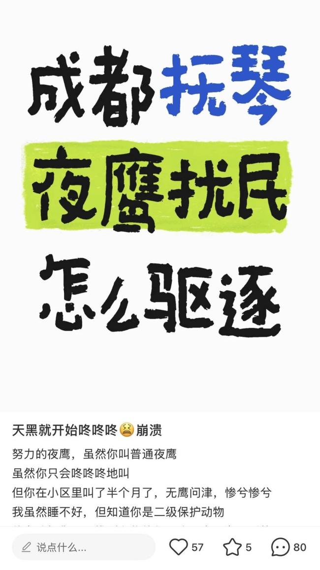 成都多个小区居民都受到这种声音的困扰。有网友发帖抱怨:“成都抚琴夜鹰扰民怎么驱逐”;另一名网友也发帖表示:“成都西门某小区,夜鹰哒哒哒的叫个不停。”