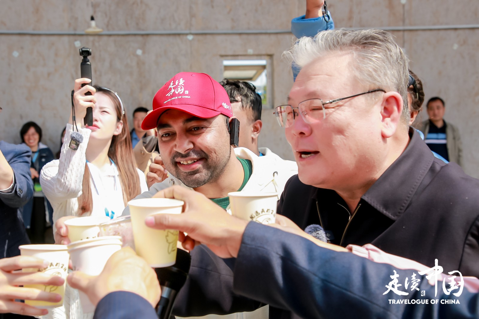 乌兰察布市科学技术事业发展中心二级推广研究员、冷凉蔬菜院士工作站负责人关慧明邀请各国记者共饮食品级生物杀虫剂。环球网供图