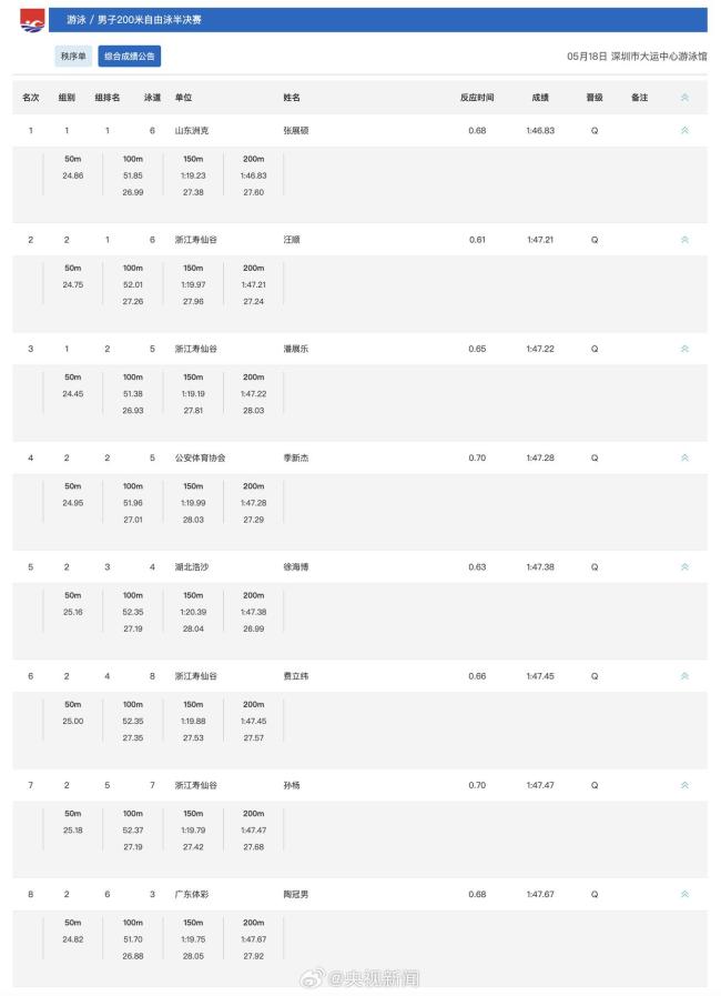 今天,在2025年全国游泳冠军赛男子200米自由泳半决赛中,潘展乐、汪顺和孙杨等选手顺利晋级。明天将进行男子200米自由泳决赛,值得期待。