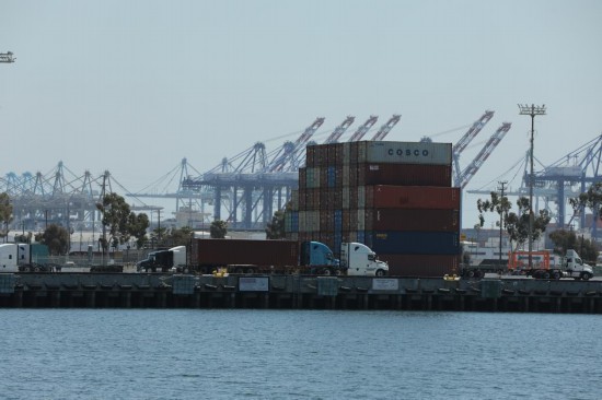 这是4月29日在美国洛杉矶港拍摄的集装箱和卡车。洛杉矶港执行董事吉恩·塞罗卡当天表示,随着美国关税政策导致企业削减进口订单,洛杉矶港下周入境货运量预计将比去年同期下跌超过35%。新华社发(邱晨摄)