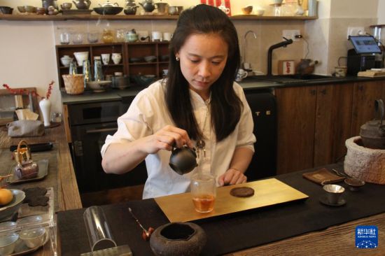 5月21日,茶艺师张乐在法国巴黎的茶室演示茶艺。新华社记者 王松宇 摄