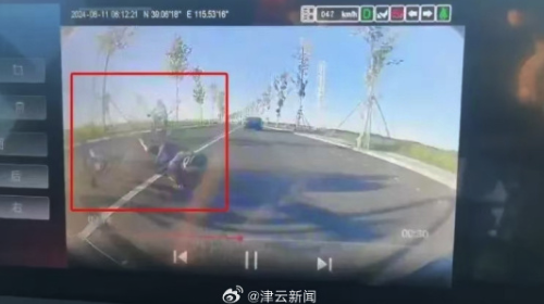 视频显示,孩子摔倒后遭行驶中的汽车碾压,头耳部出血。其父亲大喊:“坚持住,别吓我啊。”涉事汽车的行车记录仪显示,汽车车速52km/h左右,事发时汽车两侧均有骑行者。