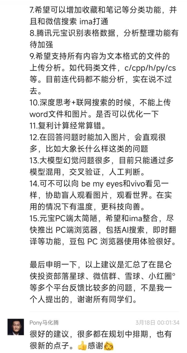 3月中旬,一名腾讯股东还将各平台社群反馈比较多的使用问题,汇总成了10多条产品建议,反馈给腾讯元宝团队。这些建议包括:复利计算总出错;大模型幻觉问题很多、需要多模型交叉印证;元宝PC端太简陋,希望和ima整合尽快推出PC浏览器等。马化腾亲自回复:「很多都在规划中排期,也有很新的点子。」