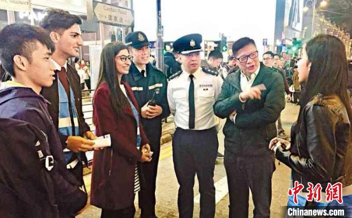 2017年12月,时任香港特区政府警务处行动处处长邓炳强(右2)与时任油尖警区指挥官周一鸣(右3)在香港尖沙咀探访担任义工的油尖警区少年警讯及“宝石计划”的学员。(香港特区政府警务处 供图)