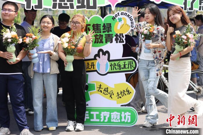 5月22日,江苏南京,大学生手拿制作好的插花拍摄合影。中新社记者 泱波 摄