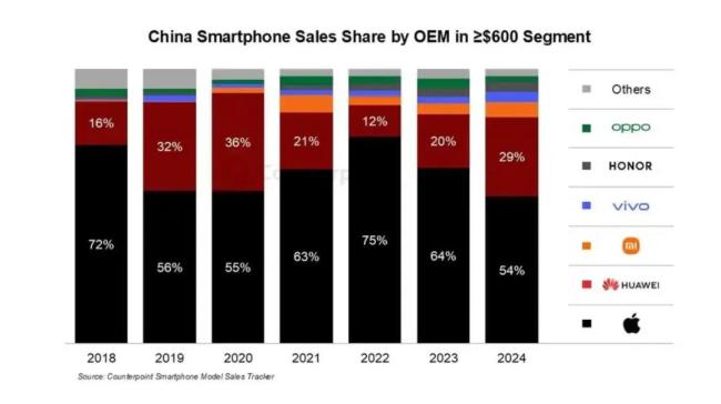当前,荣耀面临的挑战远不止华为的挤压。在高端市场,尽管Magic系列持续发力,但在600美元以上价位段,苹果依然占据着绝对主导地位。Counterpoint数据显示,华为和苹果在2024年推动了中国高端智能手机市场的发展,两者合计占该细分市场总销售额的83%。其中,苹果市场份额高达54%,依旧名列第一。