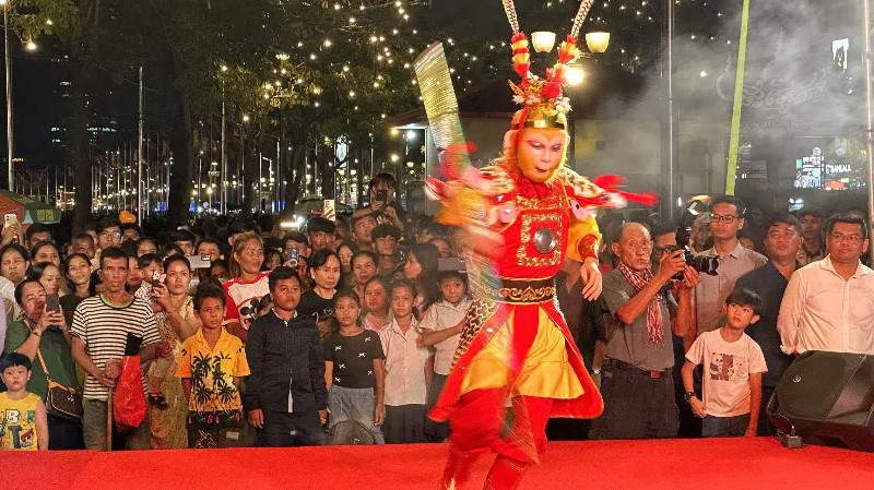 快闪活动中,中方人员精彩演绎孙悟空形象,吸引大批柬埔寨民众围观叫好。人民网记者 白元琪摄