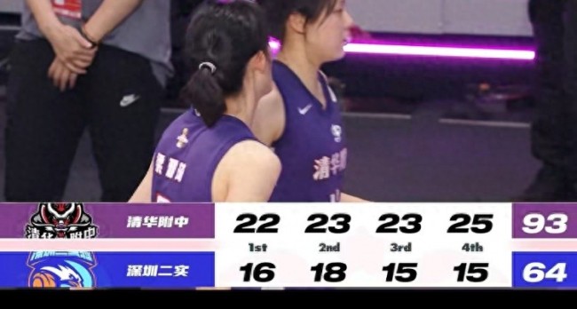 最后一节,清华附中内外开花率先拿下5分,深圳二实进攻端显得办法不多。清华附中在攻防两端都压制对手,许安琪自投自抢将分差扩大到30分。虽然两队在场上依旧全力以赴,但清华附中稳扎稳打保持优势,最终以93-64大胜深圳二实,成功卫冕冠军。