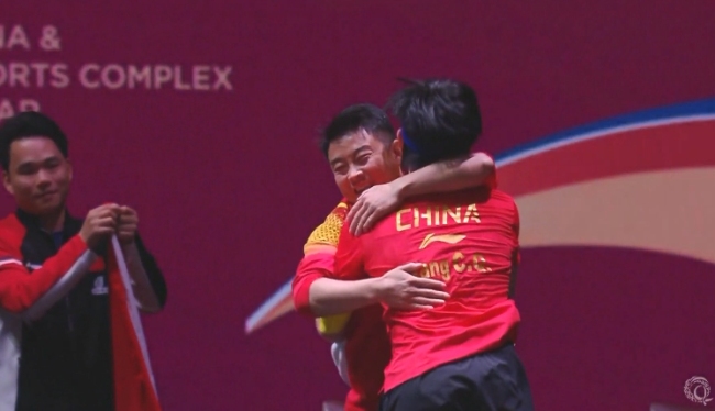 胜利后,王楚钦站在原地仰天长笑,并朝观众席指了指球衣背后的名字。
