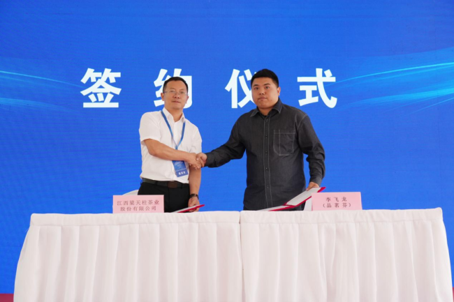 启动仪式现场,江西梁天柱茶业股份有限公司与品茗芬(李飞龙)签署合作协议,标志着茶企与主播正式携手探索数字化转型路径。随后,与会领导及嘉宾共同启动“2025新时代网络主播助力茶产业高质量发展系列活动”,象征着传统茶产业与数字经济的深度融合正式启航。