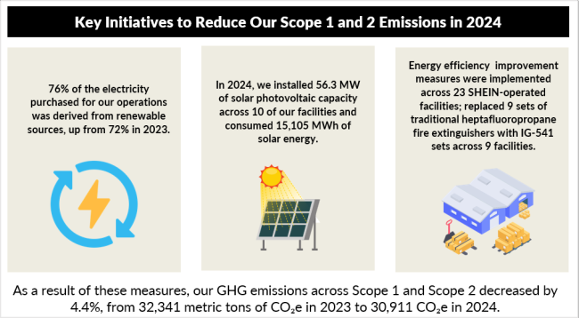 2024年,在可持续发展咨询公司Anthesis Group的支持下,SHEIN制定了脱碳路线图,以指导实现公司近期和长期减排目标。在减少范围1和范围2排放的路线图中,SHEIN优先采取了向可再生能源转型、提高能源效率以及逐步淘汰化石燃料、减少散逸排放三大行动。到2030年,SHEIN将通过增加光伏发电等形式,为所有直接运营的设施提供100%可再生电力,如今通过安装屋顶光伏等方式,SHEIN仓储物流园区等自营场所绿色电力的使用比例已达76%,并且在不断提升中;而加强能源消耗监测并升级直接管理设施的系统,可以提高能源效率并减少消耗;最后,通过向电动车转型等措施,逐步淘汰运营中化石燃料的使用。