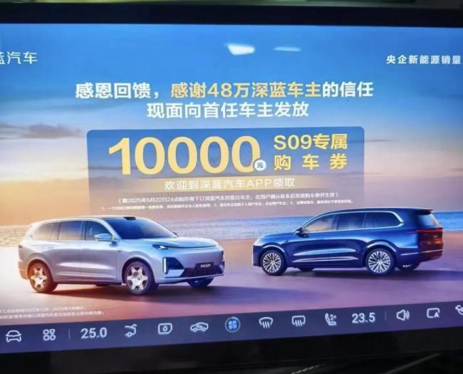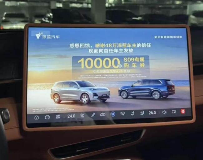 今日,大量深蓝汽车车主在社交媒体上表示,深蓝汽车强制在车内屏幕上投放广告。广告内容为:“感恩48万深蓝车主信任,现面向首任车主发放10000万元S09购车券。”