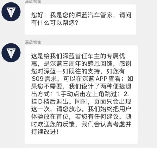 蓝鲸记者了解到,有车主就此事向深蓝汽车客服问询,客服回应称:“这是我们给深蓝首任车主的专属优惠,页面只会出现一次,如不需要可以选择退出界面。”