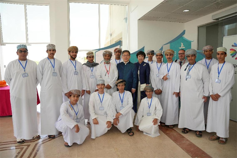 吕健大使夫妇与即将开设中文课的阿曼高中学生代表合影。中国驻阿曼大使馆供图