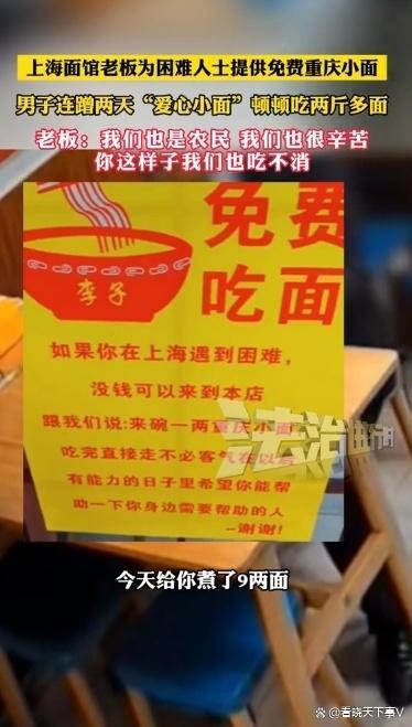 在上海的一家面馆里,老板为了帮助遇到困难的人,推出了免费的重庆小面。只要顾客进店说一句“来碗重庆小面”,就可以免费享用,无需付款。然而,一名穿着西装、打着领带的男子却连续两天来吃,并且每次都要吃二斤。这让老板感到非常困扰。