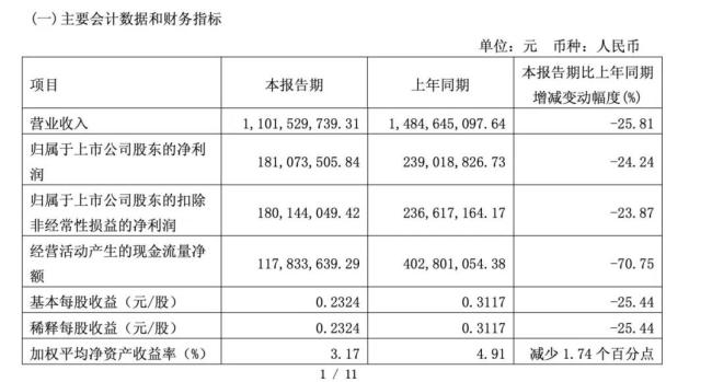 2025年一季报显示,公司一季度实现营业收入11.02亿元,同比下滑25.81%,归属于上市公司股东的净利润1.81亿元,同比下滑24.24%。
