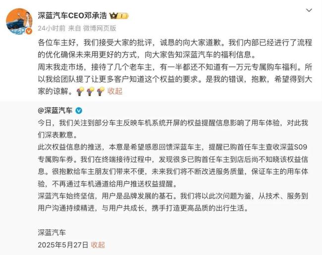 刚“员工买车送离职”,又车机投“开屏广告”,深蓝CEO连续道歉!