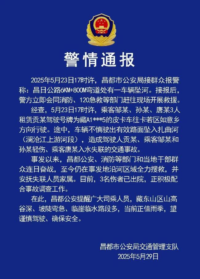 自事故发生以来,昌都公安、消防等部门以及当地干部群众一直在事发地沿河区域全力搜救,并安抚失联人员家属。目前,三名受伤者已经出院,正积极配合事故调查工作。