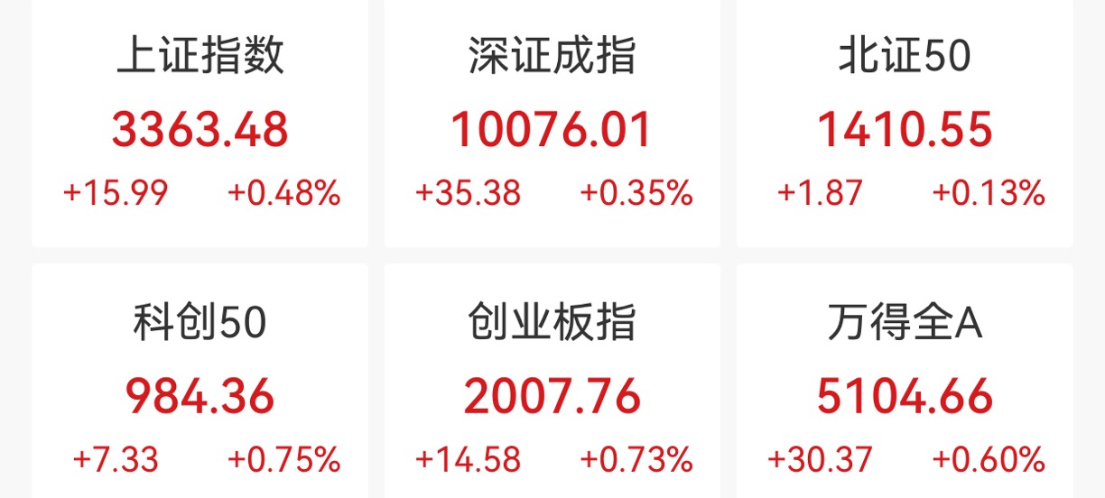 中新经纬6月3日电 3日上午,A股低开高走,创业板指领涨。截至午盘,上证指数涨0.48%,报3363.48点;深证成指涨0.35%,报10076.01点;创业板指涨0.73%,报2007.76点。