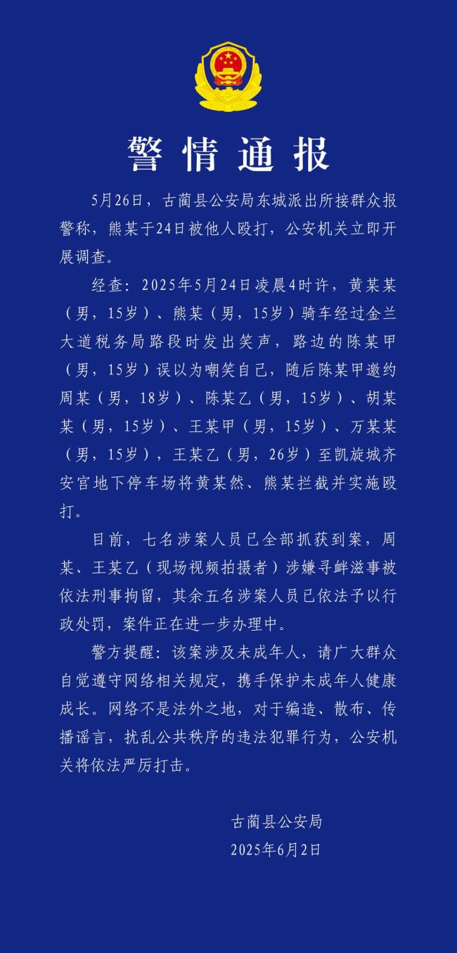 四川古蔺县警方通报了一起涉及未成年人的暴力事件。6月2日,两名未成年人骑车时发出笑声,被15岁的陈某甲误以为是在嘲笑自己。随后,陈某甲和其他六人在地下停车场对这两名未成年人进行了殴打。目前,七名涉事人员均已被警方抓获,其中两人已被刑事拘留。