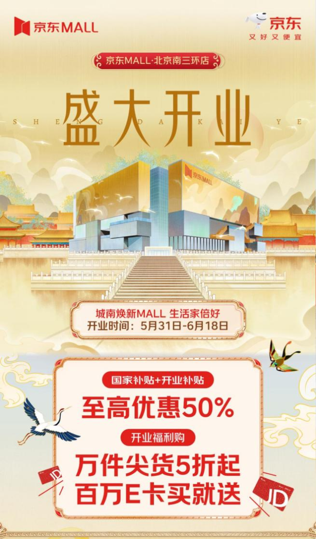 值得一提的是,在“国补”政策的持续发力下,京东MALL(北京南三环店)也将成为北京最大的家电家居3C一体化国补体验卖场。5月31日—6月18日开业活动期间,消费者还可享受政府+开业双重补贴,商品最高优惠50%。