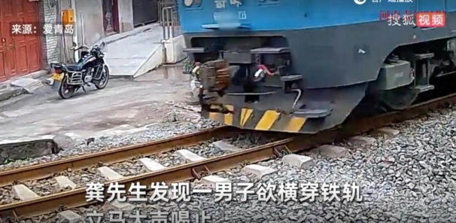居民喝退横穿铁轨男子火车瞬间驶过。6月3日,重庆,龚先生发现一外地男子欲横穿铁轨,立即大声喝止。该男子后退几步后停止行动,此时火车驶过。