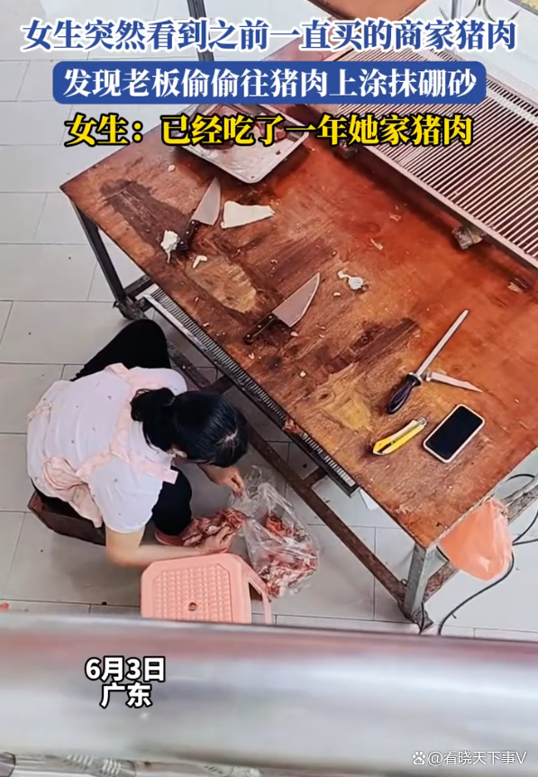 防不胜防!广东,一女子去市场买菜,偶然看到一卖猪肉的商贩,在往猪肉上面涂抹硼砂,女子瞬间破防,因为这家猪肉,她已经吃了一年,很难想象这么长时间吃的肉,全都是这样的!网友:必须严判,罚它个倾家荡产。