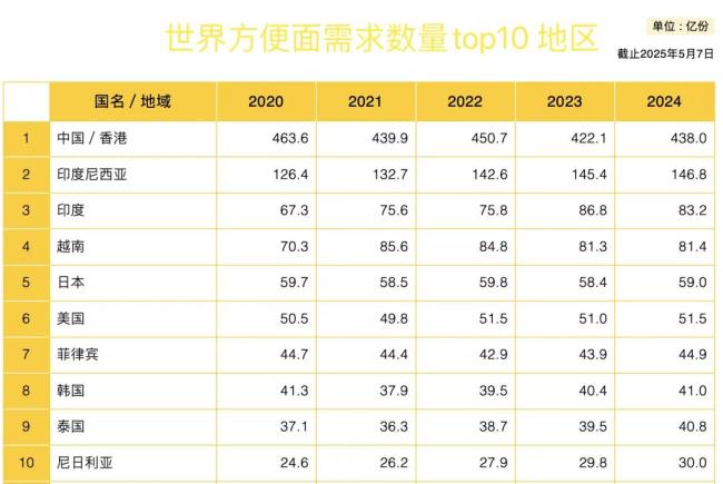 根据世界方便面协会(WINA)2025年5月7日更新的世界方便面总需求量显示,2020年至2024年,中国(包含中国香港和台湾省)的方便面需求分数分别为472.3亿份、448.9亿份、459.5亿份、431.2亿份和447.3亿份。