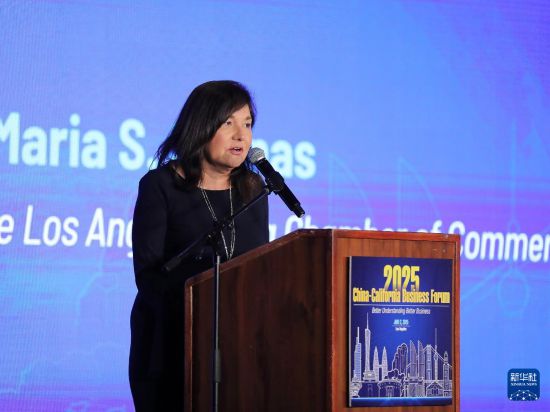 6月2日,在美国洛杉矶,洛杉矶地区商会主席玛丽亚·萨利纳斯在2025年中国—加州经贸论坛上发表讲话。新华社发(邱晨摄)