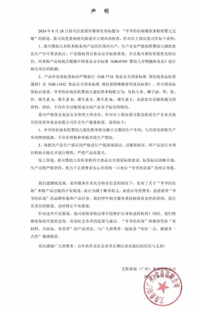 “爷爷的农场”(Grandpa's Farm)官方网站显示,该品牌所属公司为艾斯普瑞企业有限公司(中国香港),主营品类包含婴幼儿辅食、零食、食用油及调味品等。