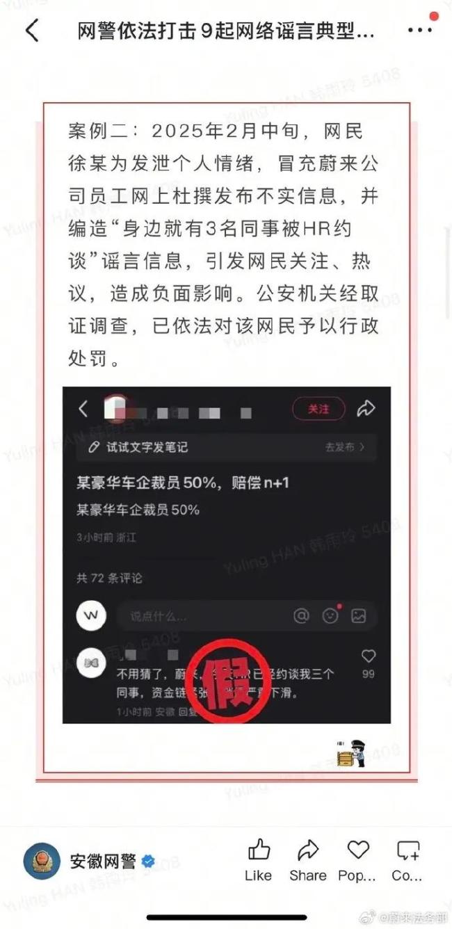 6月8日,蔚来法务部发文称,安徽省公安厅近期通报了侦办涉及蔚来的谣言案件结果。这些案件包括造谣蔚来被收购以及冒充蔚来员工散布不实经营信息等,多名违法人员已被行政拘留和处罚。蔚来对公安机关打击网络谣言、净化网络环境表示感谢,并将继续配合警方打击此类行为,及时公示进展。