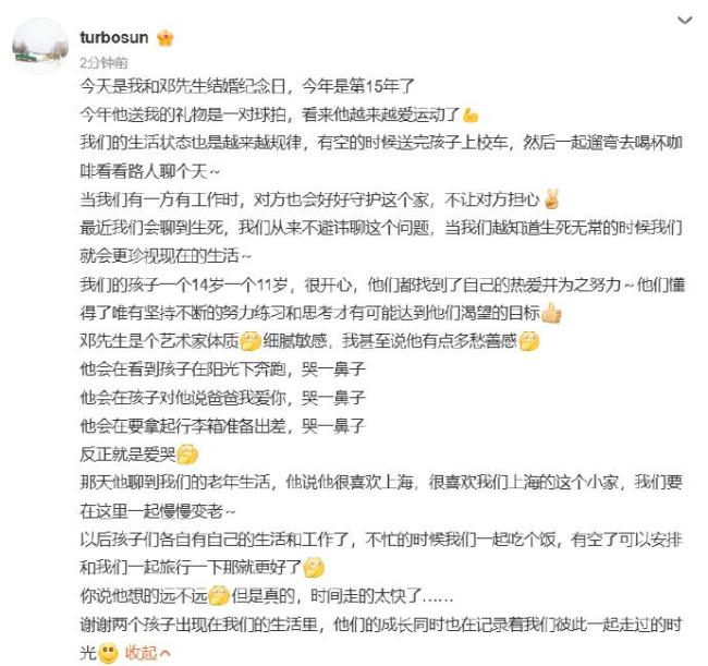 6月7日,孙俪在社交媒体上发文庆祝与邓超结婚15周年。她提到邓超送给她的礼物是一对球拍,并表示两人的生活越来越规律。有空的时候,他们会送孩子上校车,然后一起遛弯、喝咖啡、看路人聊天。当一方有工作时,另一方会好好守护这个家,不让对方担心。