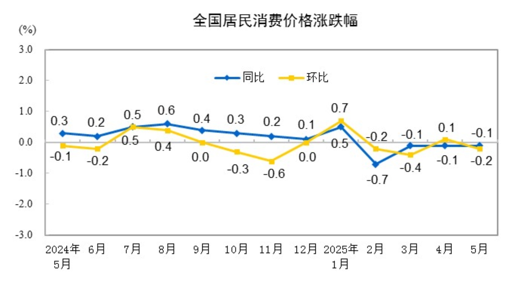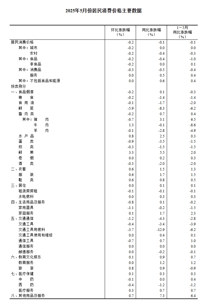 中新网6月9日电 据国家统计局网站消息,2025年5月份,全国居民消费价格同比下降0.1%。其中,城市持平,农村下降0.4%;食品价格下降0.4%,非食品价格持平;消费品价格下降0.5%,服务价格上涨0.5%。1—5月平均,全国居民消费价格比上年同期下降0.1%。