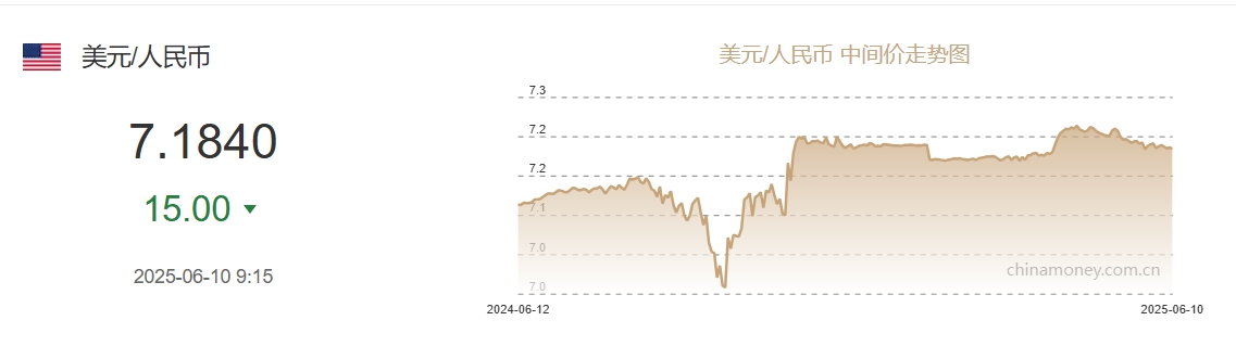 中新网6月10日电 据中国外汇交易中心网站消息,中国人民银行授权中国外汇交易中心公布,2025年6月10日银行间外汇市场人民币汇率中间价为:1美元对人民币7.1840元。