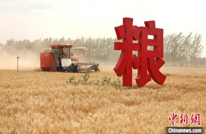 6月5日,河南省开封市尉氏县,农机手在农田中的“藏粮于地”标识旁抢收小麦。李新义 摄
