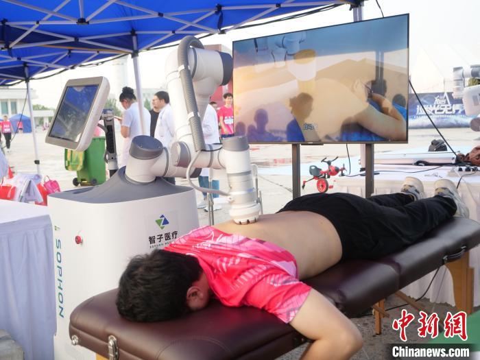 按摩机器人为运动员进行按摩放松。中新网记者张俊 摄