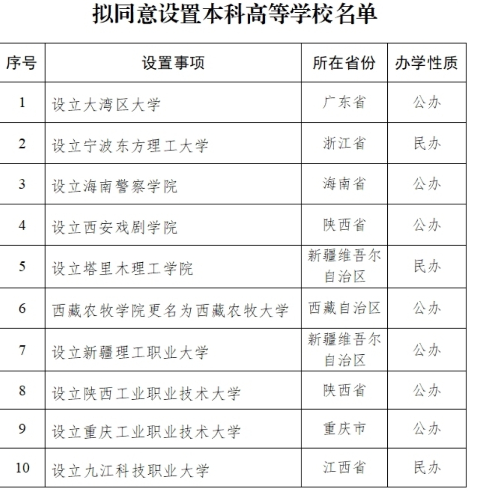根据《中华人民共和国高等教育法》《普通高等学校设置暂行条例》《普通本科学校设置暂行规定》《本科层次职业学校设置标准(试行)》等有关规定以及第八届全国高等学校设置评议委员会考察评议结果,经教育部党组会议审议,拟同意设置大湾区大学等10所学校,现予公示。公示时间为2025年6月11日至6月17日。