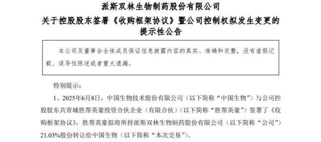 6月9日晚间,派林生物发布公告称,中国生物技术股份有限公司(简称“中国生物”)与公司控股股东共青城胜帮英豪投资合伙企业(有限合伙)(简称“胜帮英豪”)签署了《收购框架协议》,胜帮英豪拟将所持派林生物21.03%股份转让给中国生物。
