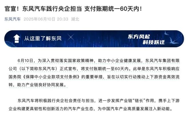 6月10日,多家车企官宣将实行新的账期计算模式。其中,广汽集团在行业中首个官宣,“坚持以不超过60天的供应商账期”。而东风汽车集团有限公司(以下简称东风汽车)也在当日晚间正式宣布,将支付账期统一至60天内。一汽集团同样在当晚发布公告,宣布将账期控制在60天以内,并且给出了很细致的方案。