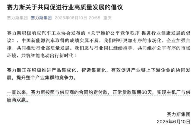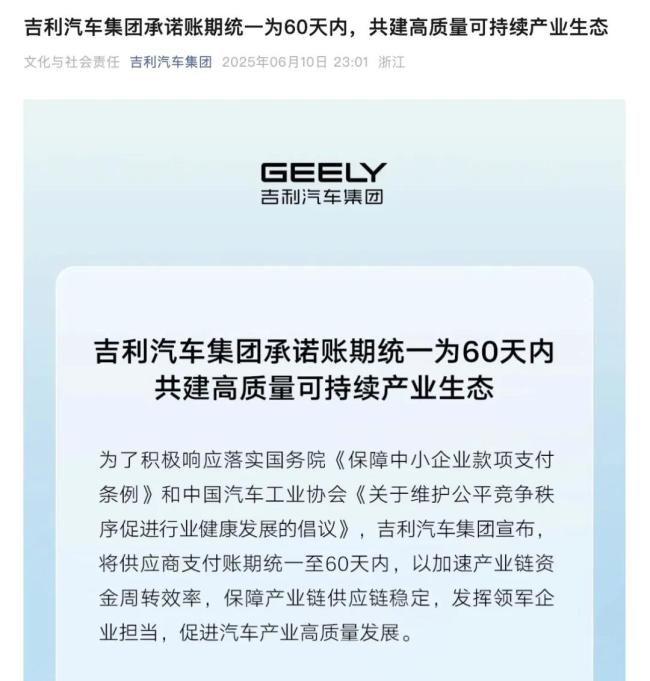 而民营车企方面,目前仅有赛力斯和吉利两家表态。当天晚上,赛力斯表示,一直以来都是按照与供应商的合同约定付款,正常货款账期60天。随后,吉利也宣布,将供应商支付账期统一至60天内,以加速产业链资金周转效率,保障产业链供应链稳定。