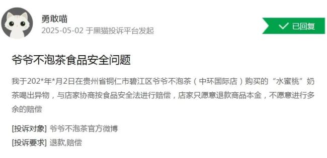 黑猫投诉平台数据显示,2025年1-5月,针对爷爷不泡茶的投诉量同比增长200%,涉及“饮品中出现苍蝇”“喝出塑料异物”“糖度误差超标”等问题。例如,5月2日有消费者在贵州铜仁门店购买的“水蜜桃奶茶”中喝出异物,店家仅退款本金,拒绝按《食品安全法》赔偿;5月9日,湖北咸宁门店被曝“荔枝冰酿中喝出苍蝇”,引发舆论哗然。