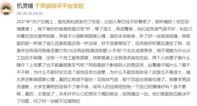 除产品质量外,服务投诉同样激增。例如,4月26日有消费者投诉服务员态度恶劣,影响顾客体验。这些事件反映出品牌在加盟店培训与监督上的不足。