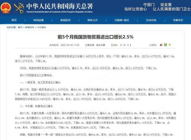 中国外贸在复杂环境中稳健前行 释放积极信号。6月9日,中美经贸磋商机制首次会议举行之际,中国海关总署发布了今年前5个月的外贸数据:1至5月,我国货物贸易进出口总值17.94万亿元,同比增长2.5%。这表明自2025年以来,中国经济持续回升向好,外贸在复杂环境中稳健前行。