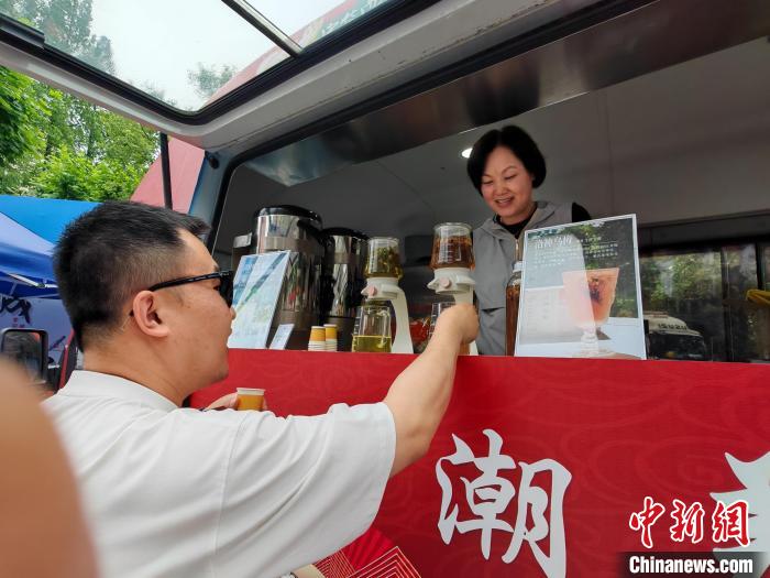 中医文化推广流动车上的茶饮吸引了不少人来品尝。(中新网记者 陈静摄)